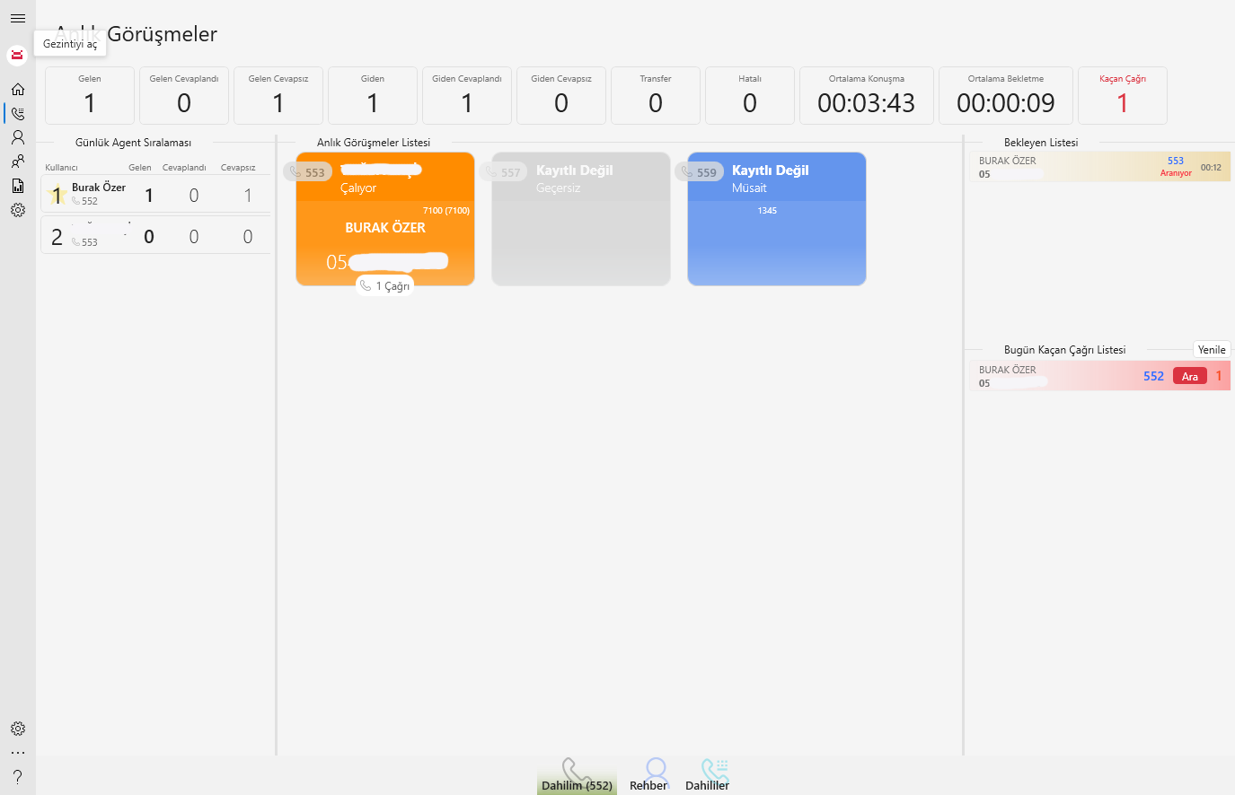 Kuyruk ta bekleyen çağrıları görebilir ve görüşme bağlanana kadar son olarak kimi aradığını ve açmadığını görebilirsiniz, aynı panelden kaçan çağrıların listesinide günlük olarak görebilir, Müşteri temsilcilerin görüşme performanslarınıda takip edebilirsiniz.