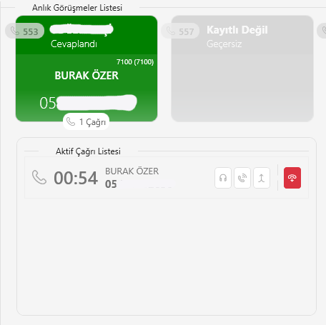 Yetkiye göre Anlık görüşmeler panelinde takip ettiğiniz kullanıcıların görüşmelerini dinleyebilir, görüşmeye katılabilir, temsilciye sufle verebilir veya görüşmeyi sonlandırabilirsiz.